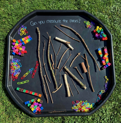 Lay out sticks of various lengths in a tuff tray or sensory bin and ask, “Can you measure the sticks?” Children will be naturally drawn to count, estimate, compare, and problem-solve as they engage in early math play in a hands-on, meaningful way.