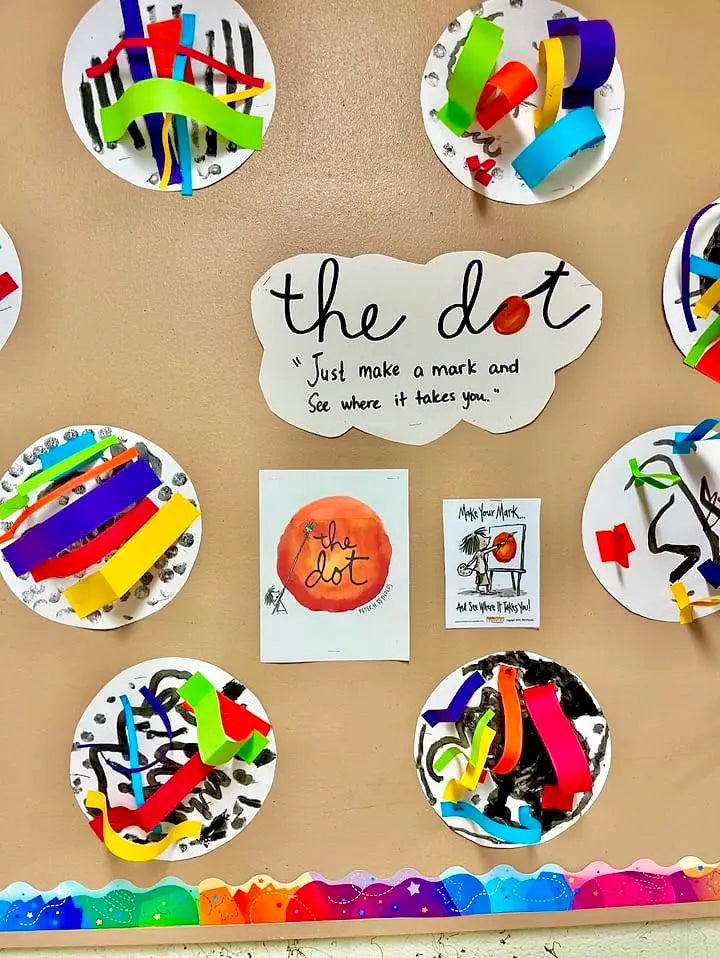 The bulletin board display of these colourful dots serves as a beautiful celebration of each child's creativity, reminding them, in the words of The Dot, that "just make a mark and see where it takes you."Â