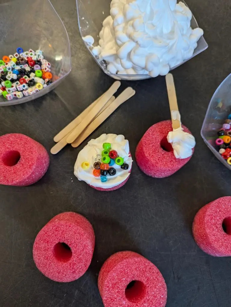 This process art and sensory play experience encourages children to freely explore materials, spreading and shaping the shaving cream on the pool noodles, and decorating their creations with vibrant beads. The combination of different textures promotes fine motor development and hand-eye coordination, while the open-ended nature of the activity fosters creative thinking and problem-solving.