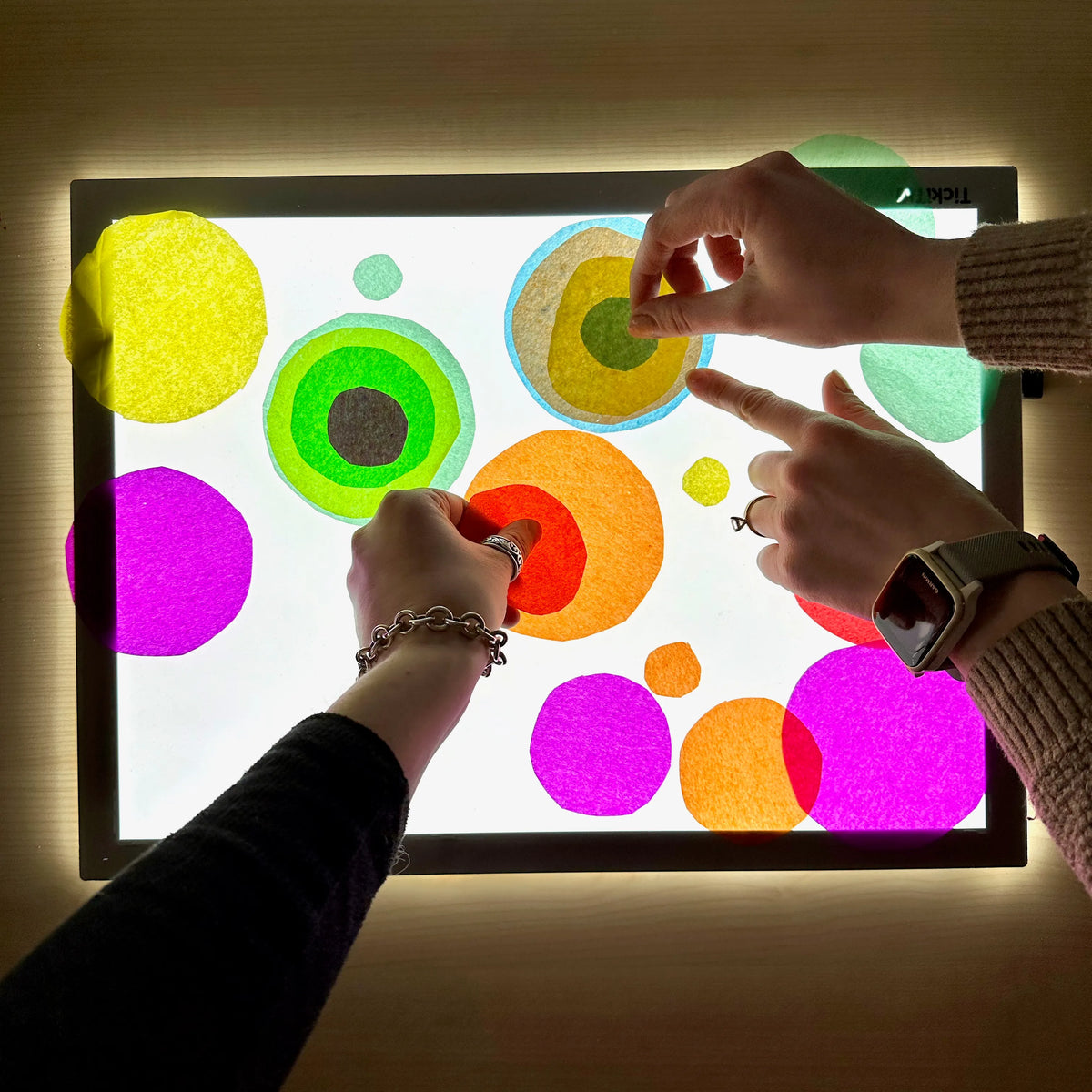 Trace circles of all sizes on your colourful tissue paper and cut them out. Then place your circles all over the light panel and place inspiration photos of Wassily Kandinsky's art around the panel so children can be inspired! Then invite them to create.