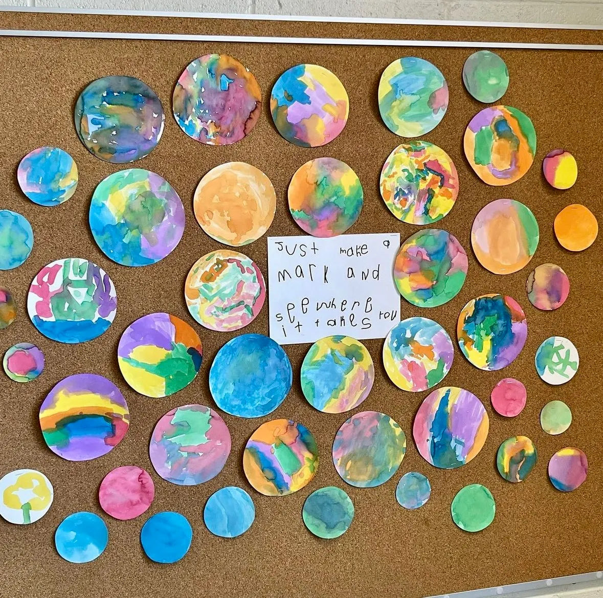 The bulletin board display of these colourful dots serves as a beautiful celebration of each child's creativity, reminding them, in the words of The Dot, that "just make a mark and see where it takes you."